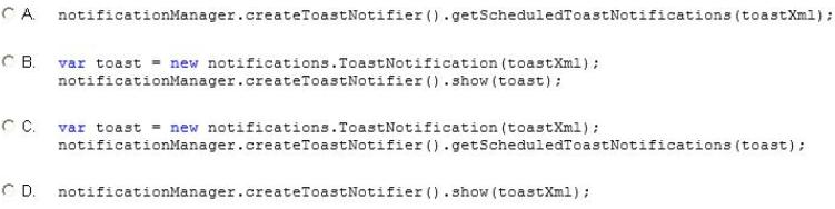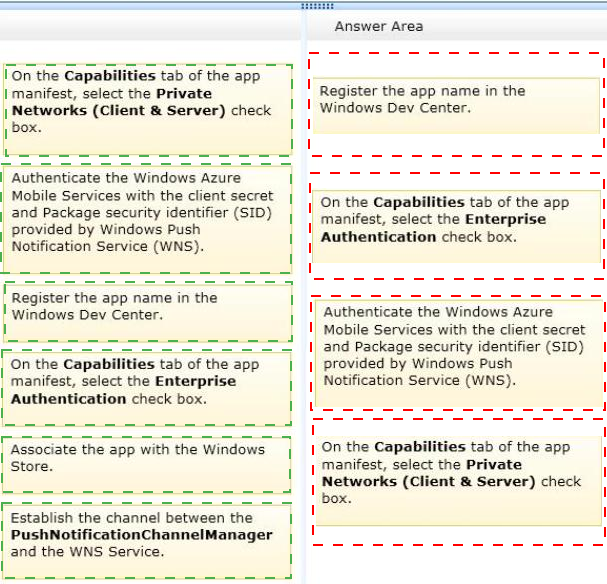 Answer : A,C Topic 4, Automotive Manufacturer Background You are developing an app for an automotive manufacturer. The app will display information about the vehicle, the vehicle owner's manual, and the maintenance schedule. The app will be available to install from the Windows Store. Business Requirements ? Display the company logo on the Main screen. Owner's Manual screen, and Service Record screen of the app. ? Allow users to store their vehicle information to identify the correct information to display within the app. ? Prominently display a stock image of the user's vehicle on the Main screen at the full height of the app. ? Send notifications by using tile updates when a scheduled maintenance is approaching or past due. ? Insert service data in the appropriate locations, and update the Service Record screen with data received from a cloud service. ? Display related media within the app. Technical Requirements The app must meet the following technical requirements. User Experience ? The app user interface must follow Microsoft design guidelines. ? The user must be able to insert or update service records. ? The user must be able to filter service records by date or service type. ? The user must be able to navigate between various parts of the app including but not limited to the Main screen, Service Record screen, and Owner's Manual screen. ? The user cannot switch between categories by using the Back button. ? The data from the cloud service must automatically populate the Service Record screen. ? The Main screen must have a dark background. All other screens must have a light background with contrasting colored text. ? All multimedia must provide a full-screen mode that can be activated by the end user. ? All media items must start when the user interacts with them and stop immediately when a video ends. ? The app must accept and display tile messages and notification messages from the cloud service. ? The navigational icons mus