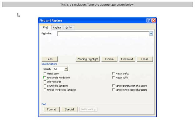 Find and Replace dialog box. What actions will you perform in the dialog box to accomplish the task?