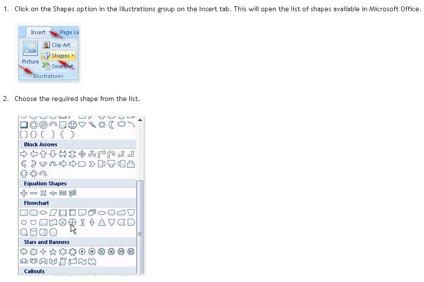 The Office includes simple shapes, such as lines, basic geometric shapes, arrows, equation shapes, flowchart shapes, stars, banners, and call outs. Users can add text, bullets, numbering, and Quick Styles to these shapes after inserting them in the document. Take the following steps to add a shape in a document: